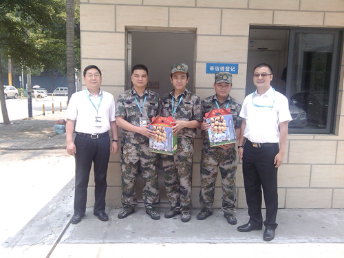8月1日,正逢建軍節,集團副董事長兼總裁吳光勝、首席科學家黃永江來到公司門崗,看望慰問在崗的保安人員,并送上節日禮品。 吳總強調“華訊方舟的保安就是華訊方舟