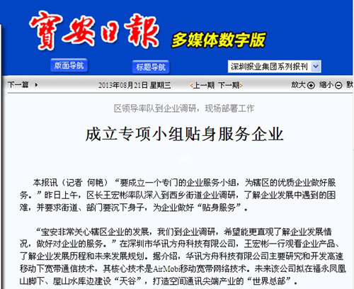 寶安區(qū)成立“華訊事務(wù)專(zhuān)項(xiàng)小組”,區(qū)長(zhǎng)親任組長(zhǎng)支持這家落戶(hù)寶安的先驅(qū)企業(yè)。該企業(yè)AirMobi技術(shù)解決了現(xiàn)在WIFI不能支持移動(dòng)寬帶上網(wǎng),這一移動(dòng)與帶寬沖突世界級(jí)技